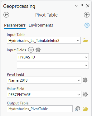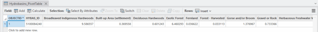 As we may have expected, we’ve got a record for each Name_2018 value with AREA and PERCENTAGE fields and all the HYBAS_IDs are the same. This has tallied things up for us nicely but as a next step, we’ll attach these back to our catchment polygon using Pivot Table.