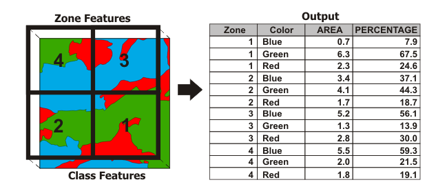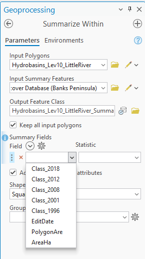 The Zone features are the polygons we want to summarise within while the Class features are what we want to summarise. In the output (which is a table) each Zone can have multiple rows – one for each class within it. Plus, we get Area and Percentage in one fell swoop. Let’s try it on our Little River Catchment: