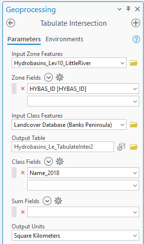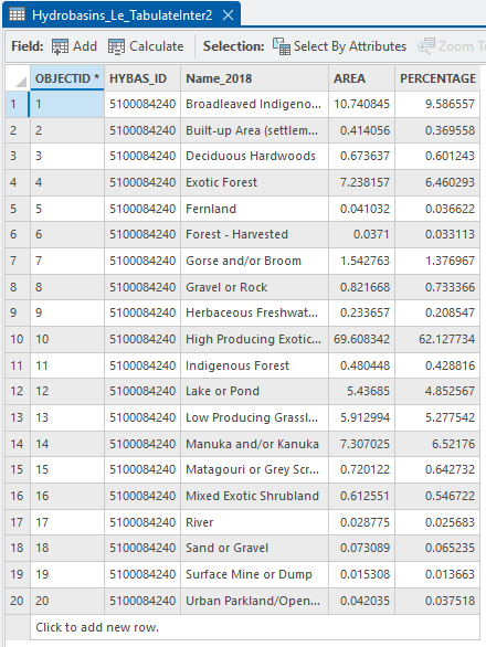 See how each of the class names is now a field? It’d be easy to assume that the values for each field are in square kilometers (especially as I’ve set the Shape Unit to these units) but they are actually percentages of the total catchment area. I only picked this up on a very careful reading of the help files. Note that since my input polygon layer has only one record, there’s only one output record – but there’s no problem with having multiple input polygons. For New Zealand, HydroBASINs at level 10 has 1,849 catchments which you could do all at once.