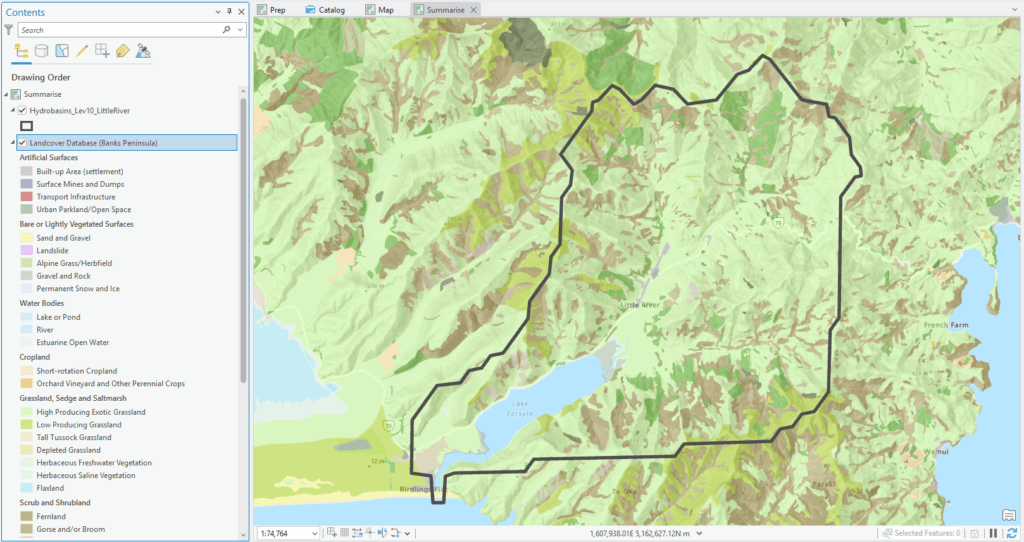 Polygons give us a handy way of creating zones, within which we might be interested in knowing what’s going on. Think of country boundaries, regions, school zones or even your own property boundary. Within those zones we often need to summarise some other phenomenon or physical characteristic. Suppose, for example, we’re interested in getting a breakdown of landcover within a river catchment. Sounds like it should be a pretty easy thing in GIS, yeah? Well, not necessarily. At least I haven’t found a straightforward way to do it yet so here I’ll outline two ways to do this. To give us some context, we’ll work with the catchment for Lake Forsyth/Wairewa on Banks Peninsula (which is composed of several different rivers and the lake):